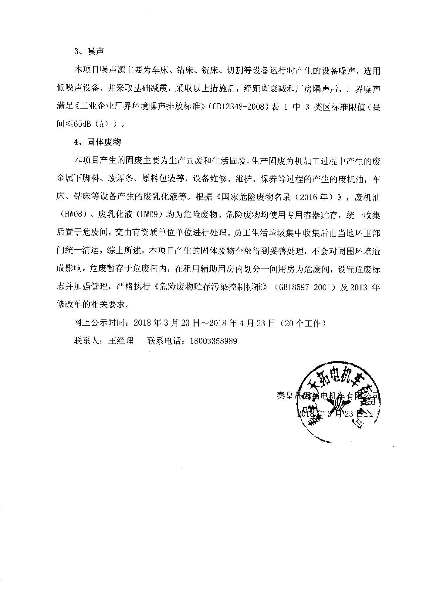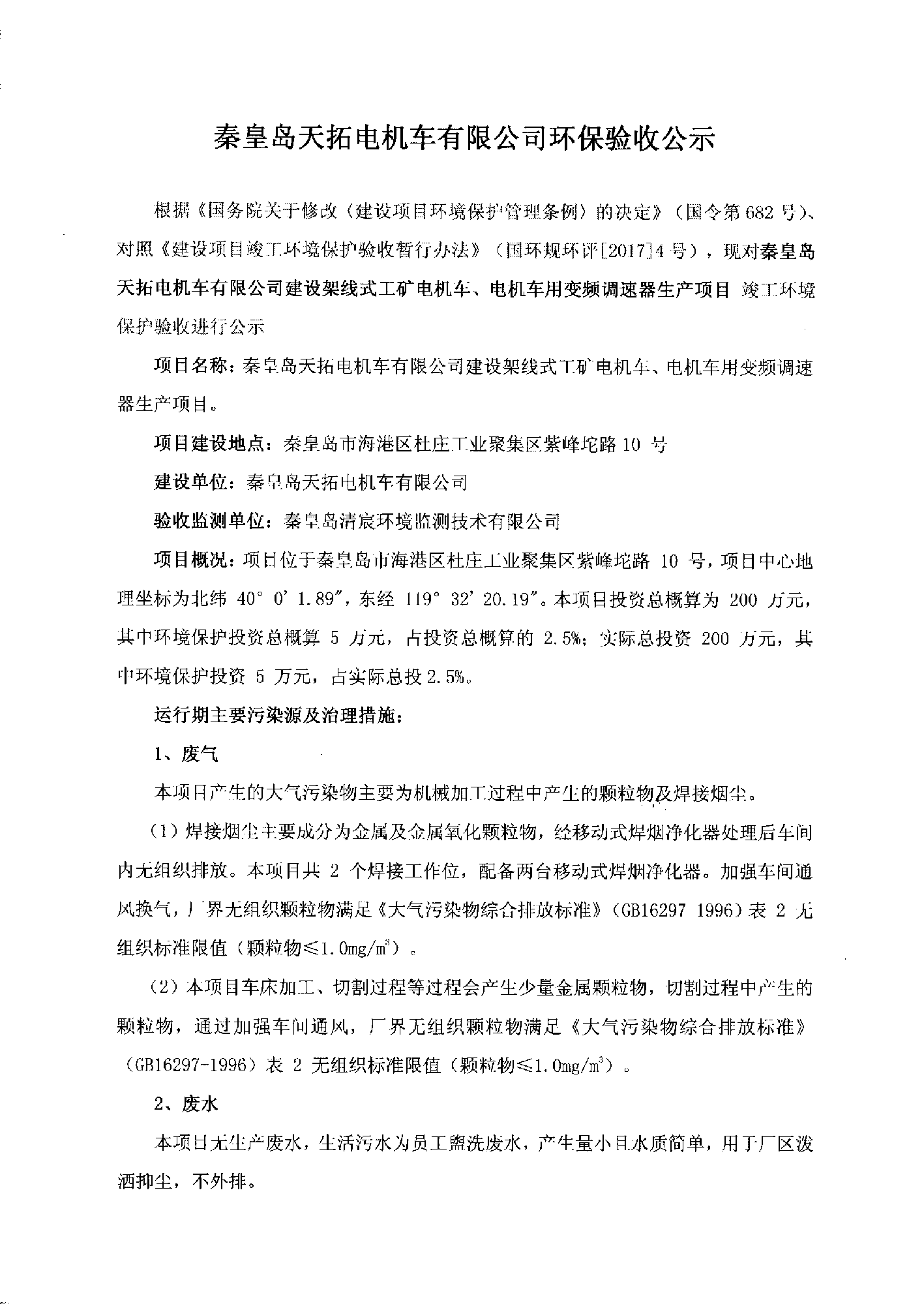 秦皇島天拓電機(jī)車有限公司環(huán)保驗收公示